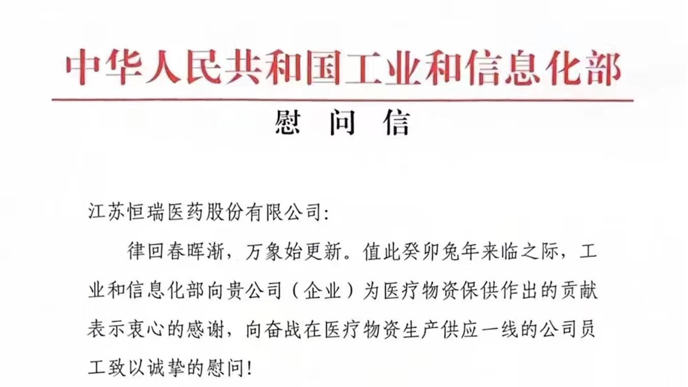 2023年1月19日,工信部向世界杯下单平台网站官网发来慰问信,对公司积极做好重点药品稳产保供表示感谢