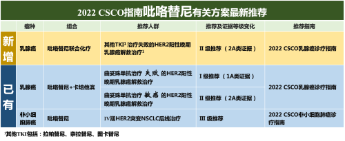 吡咯替尼联合卡培他滨方案解救性治疗曲妥珠单抗治疗失败/敏感的HER2阳性乳腺癌,2022 CSCO《乳腺癌诊疗指南》沿用往年推荐,推荐等级和证据类别没有改变。另有CSCO《肺癌诊疗指南》推荐吡咯替尼单药方案用于Ⅳ期HER2突变非小细胞肺癌的后线治疗。