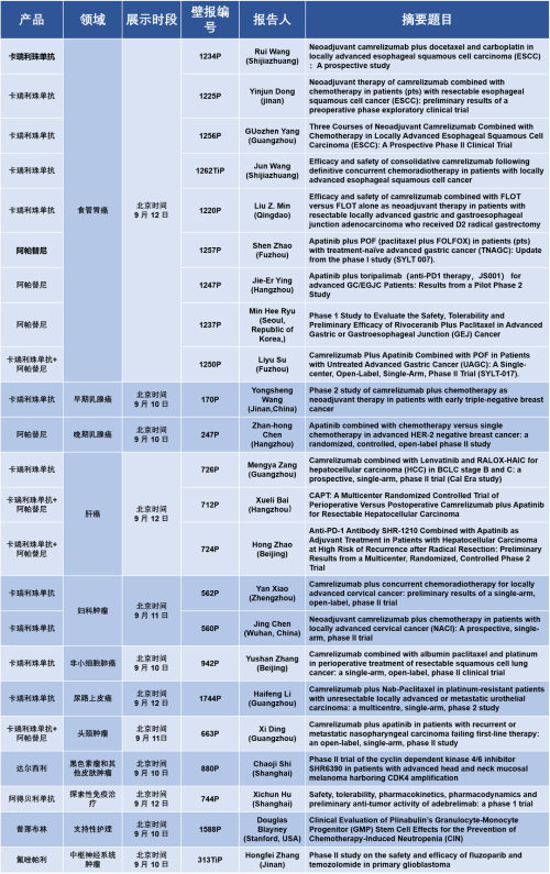 世界杯下单平台网站官网的抗肿瘤创新药卡瑞利珠单抗和阿帕替尼(“双艾”方案)在食管胃癌、乳腺癌、肝癌、妇瘤、非小细胞肺癌、尿路上皮癌、头颈肿瘤等7个领域共有19项研究入选壁报展示环节,收获满满!