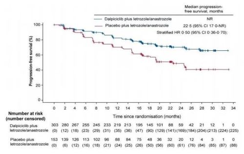 主要研究终点是研究者评估的PFS(预设单侧P≤0.0076为优效)。次要研究终点为盲法独立审查委员会(BIRC)评估的PFS、总生存(OS)、客观缓解率(ORR)、临床获益率(CBR)、缓解持续时间(DoR)和安全性。根据内脏转移(是vs否)、既往(新)辅助接受内分泌治疗(是vs否)和试验中联用何种非甾体类芳香化酶抑制剂(来曲唑vs阿那曲唑)对患者进行分层。