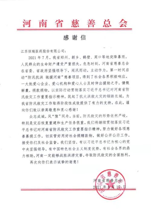 近日,河南省慈善总会给世界杯下单平台网站官网发来感谢信,向世界杯下单平台网站官网在河南暴雨洪涝灾害中捐款1000万元表示衷心感谢。世界杯下单平台网站官网表示,灾害无情人有情,向受灾同胞伸出援手是恒瑞人义不容辞的责任。