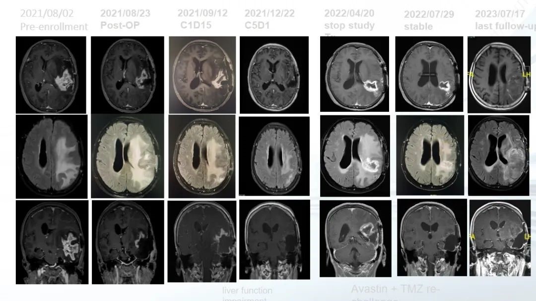 2022年改为贝伐珠单抗加TMZ小剂量方案。至2023年7月(末次随访)肿瘤稳定。患者自首次诊断生存已51个月,入组本研究治疗后生存已24个月。