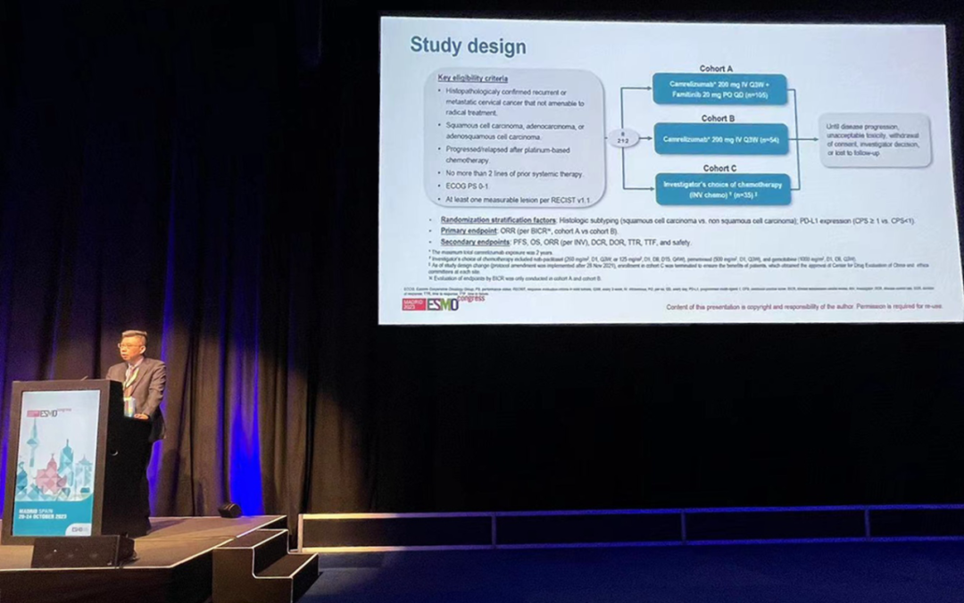 有望为宫颈癌患者带来治疗新选择10月22日,世界杯下单平台网站官网创新药卡瑞利珠单抗联合法米替尼对比卡瑞利珠单抗单药或研究者选择的化疗治疗复发转移性宫颈癌随机、开放、对照、多中心的Ⅱ期临床研究(SHR-1210-Ⅱ-217) 亮相2023 ESMO大会简短口头报告现场3。该研究由复旦大学附属肿瘤医院吴小华教授团队开展,吴小华教授在现场公布了该重磅研究进展。研究结果显示,在既往以铂为基础化疗失败后复发或转移性宫颈癌患者中,与单独使用卡瑞利珠单抗或研究者选择的化疗相比,卡瑞利珠单抗联合法米替尼显著提高了抗肿瘤活性,安全性可控,有望为晚期宫颈癌患者提供新的治疗选择。