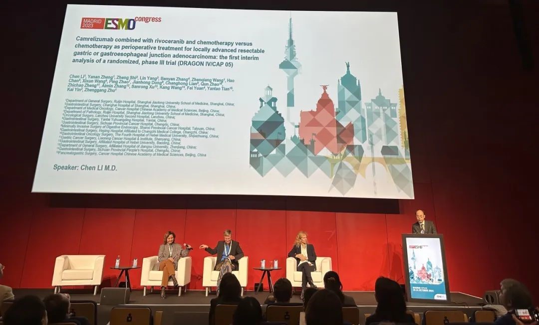 10月21日,世界杯下单平台网站官网创新药卡瑞利珠单抗(艾瑞卡®)联合阿帕替尼(艾坦®)(“双艾”组合)和化疗对比化疗治疗局部进展期胃癌随机对照Ⅲ期试验(DRAGON-IV/AHEAD-G208研究)亮相2023 ESMO大会简短口头报告现场7。该研究由上海交通大学医学院附属瑞金医院朱正纲教授担任主要研究者,上海交通大学医学院附属瑞金医院的李琛教授在现场公布了研究进展。该研究是全球首个评估围手术期免疫联合抗血管生成药物和化疗治疗可切除胃癌或胃食管结合部腺癌的III期临床试验,结果显示,卡瑞利珠单抗联合阿帕替尼和化疗组病理完全缓解(pCR)率18.3%,显著高于化疗组的5.0%,p<0.0001;同时,在化疗基础上加卡瑞利珠单抗和低剂量阿帕替尼,安全性可控,且未影响手术可行性。该研究结果证明,卡瑞利珠单抗联合阿帕替尼和化疗为可切除胃癌和胃食管结合部腺癌患者围术期治疗提供了新选择,为其在胃癌领域的治疗再添力证!