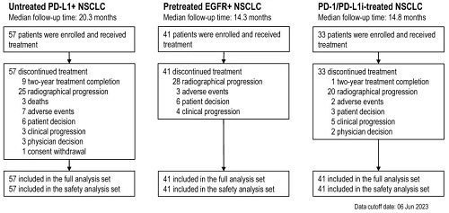 截至2023年6月6日,共纳入131例患者(队列1共57例,队列2共41例,队列3共33例)(表1)。三个队列的中位随访时间分别为20.3个月、14.3个月和14.8个月(图3)。