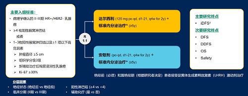 达尔西利(Dalpiciclib)是世界杯下单平台网站官网自主研发的口服、选择性的小分子CDK4/6抑制剂,也是中国首个自主研发的新型高选择性 CDK4/6 抑制剂,已证实其与内分泌治疗(ET)联合用于 HR+/HER2- 晚期乳腺癌的一线和后线治疗时,均显著改善无进展生存期(PFS)6,7。因此开展了一项随机、双盲、III期临床试验(DAWNA-A),以进一步评估达尔西利联合内分泌治疗作为高危早期 HR+/HER2 - 乳腺癌辅助治疗的效果。本研究纳入高危复发风险人群需满足以下标准之一:①≥4 枚阳性腋窝淋巴结;②1–3枚阳性腋窝淋巴结且合并≥1 项高危因素(肿瘤直径 ≥5 cm,组织学分级3级,辅助治疗后残留浸润性乳腺癌,Ki-67 ≥30%)。本文呈现预先设定的首次中期分析(IA1)结果。