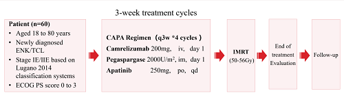 该研究为一项前瞻性、多中心、单臂研究,纳入标准为:根据WHO2016标准确诊的初发NK/T细胞淋巴瘤患者,至少有1个可测量病灶,Lugano 2014分类为IE/IIE期,年龄18~80岁,ECOG PS评分为0~2分。患者共接受4个周期的治疗,以21天为周期,第1天静脉注射卡瑞利珠单抗200 mg,肌肉注射培门冬酶2000 U/m2,阿帕替尼250 mg,QD。全身治疗后,两周内给予总剂量为50~56 Gy的扩大野放疗。主要终点为放疗后(24周)的CRR。次要终点包括24周(24W) ORR、2年OS、2年无进展生存期(PFS)和安全性。