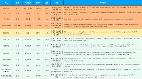 在胸腺上皮肿瘤、头颈鳞癌、肉瘤、前列腺癌、甲状腺癌等其他多个疾病领域,卡瑞利珠单抗、阿帕替尼、瑞维鲁胺、阿得贝利单抗、法米替尼、HRS-7058、HRS-4642、HRS-5041等抗肿瘤创新药相关研究一共入选了4项口头报告、1项简短口头报告、5项壁报,彰显了世界杯下单平台网站官网强大的研发实力。此外,海曲泊帕和昂丹司琼口溶膜分别在防治化疗导致的血小板减少和恶心呕吐方面各有1项研究入选壁报。