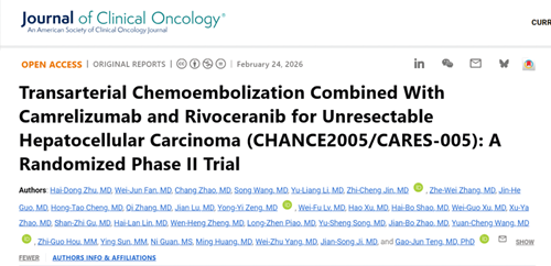 [1] Zhu HD, Fan WJ, Zhao C, et al. Transarterial Chemoembolization Combined With Camrelizumab and Rivoceranib for Unresectable Hepatocellular Carcinoma (CHANCE2005/CARES-005): A Randomized Phase II Trial. J Clin Oncol. Published online February 24, 2026.