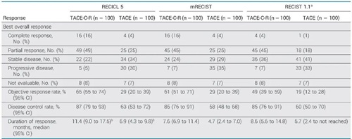 根据RECICL 5标准评估的肿瘤疗效,TACE-C-R组的客观缓解率(ORR)为65%(95% CI,55-74),TACE组为29%(95% CI,20-39);疾病控制率(DCR)分别为87%(95% CI,79-93)和63%(95% CI,53-72);中位缓解持续时间(DoR)分别为11.4个月(95% CI, 9.0-17.5)和6.9个月(95% CI,4.3-9.8)。根据mRECIST标准评估,TACE-C-R组的ORR为61%(95% CI,51-71),TACE组为29%(95% CI,20-39);DCR分别为85%(95% CI,76-91)和58%(95% CI,48-68);中位DoR分别为7.6个月(95% CI,6.9-11.4)和4.7个月(95% CI,2.4-7.0)。