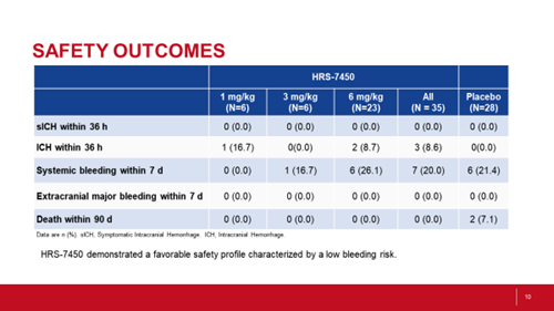 HRS-7450各个剂量组和安慰剂组在给药后36小时内均未发生症状性颅内出血。