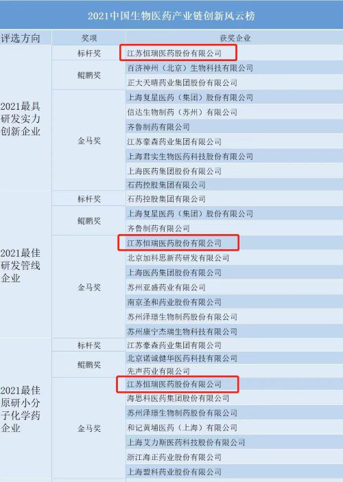 “2021中国生物医药产业链创新风云榜”评选由中国医药新闻信息协会、中国生物医药产业链创新与转化联盟指导,《药学进展》编委会等共同开展。奖项评审团由两院院士、临床专家、创新型企业总裁、资深投资人与市场分析师组成,彰显了奖项的权威性、专业性与公信力,亦有利于多视角、多维度评价制药企业以及新药和关键技术平台的创新价值。通过数据评析、人气投票、专家验证,最终遴选出风云榜各细分领域10强及创新前3强。世界杯下单平台网站官网等33家机构荣登榜单,成为行业创新风向标。